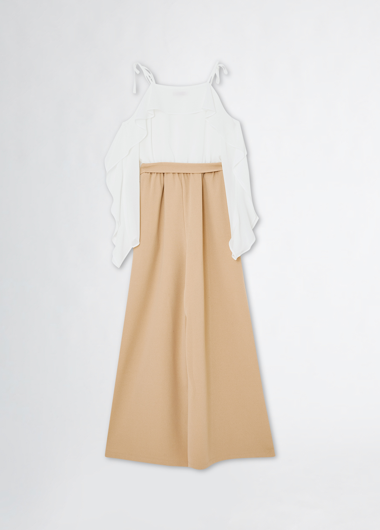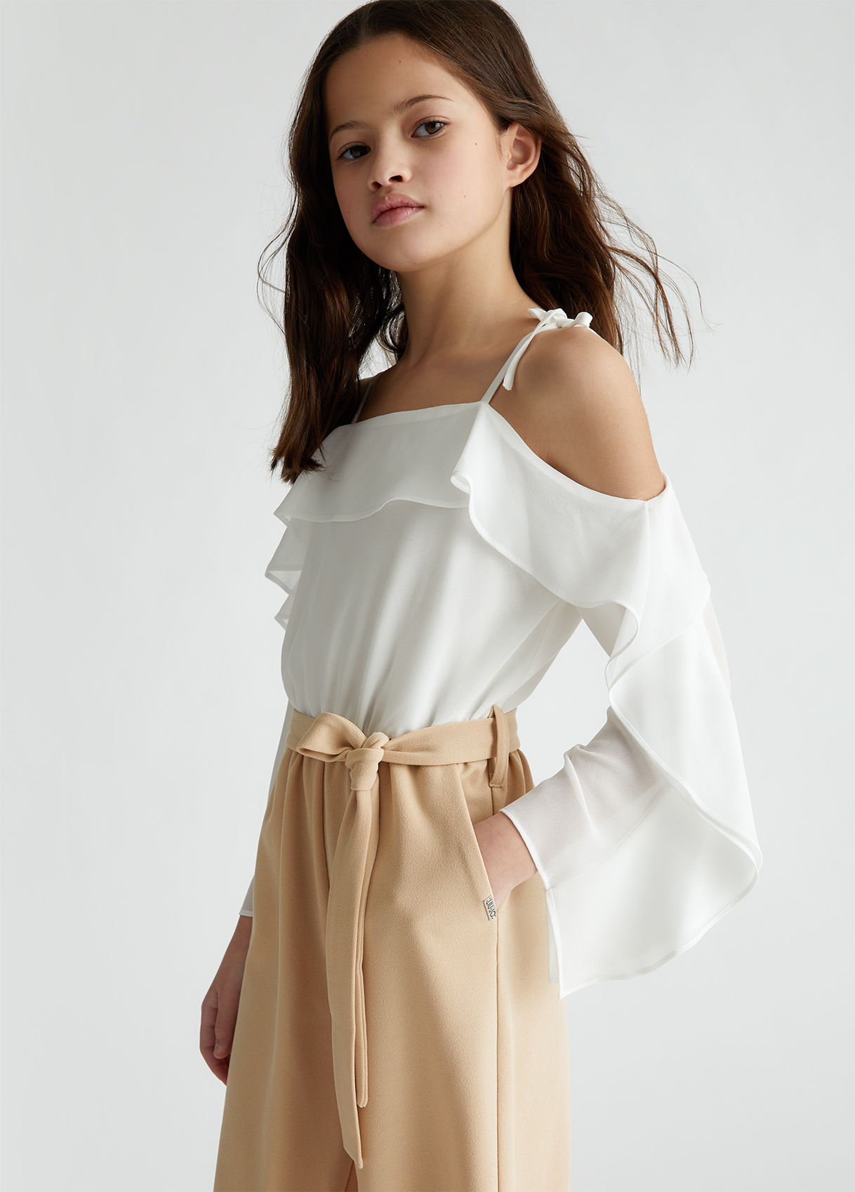 TUTA PER RAGAZZA CON CAMICIA BIANCA E PANTALONE BEIGE.