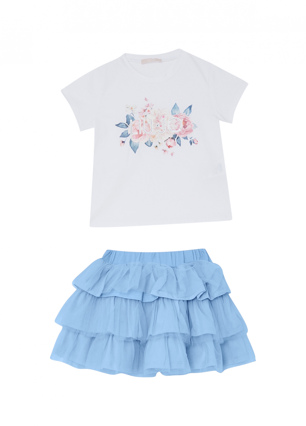 T-SHIRT BIANCA CON STAMPA E GONNA CELESTE IN TULLE.