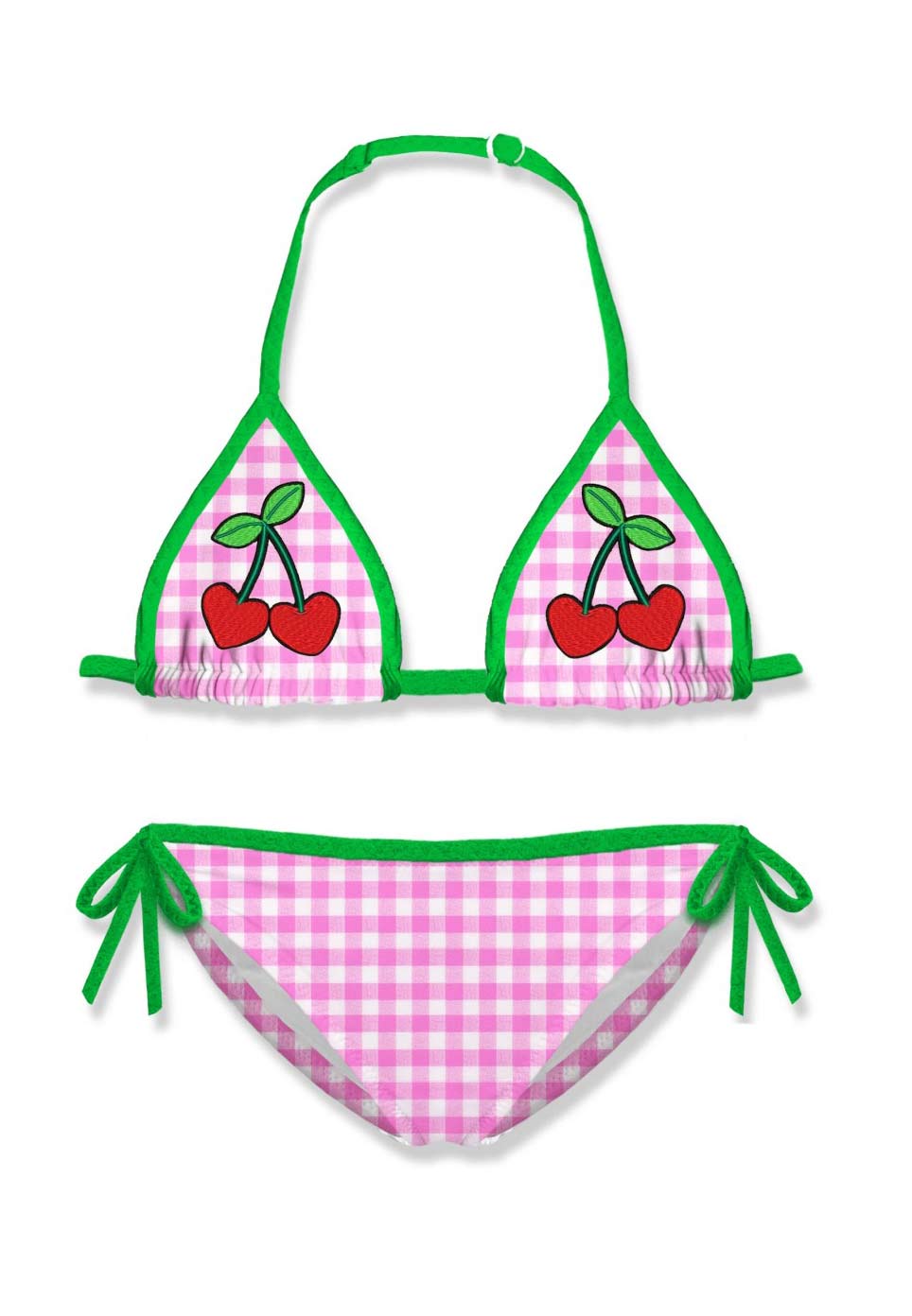 BIKINI A QUADRI ROSA E BIANCO CON BORDO VERDE.