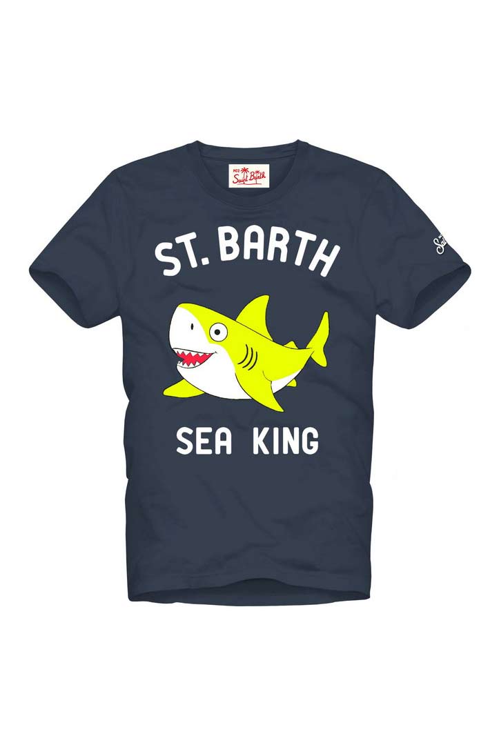 T-SHIRT BLU CON STAMPA SQUALO GIALLO FLUO.