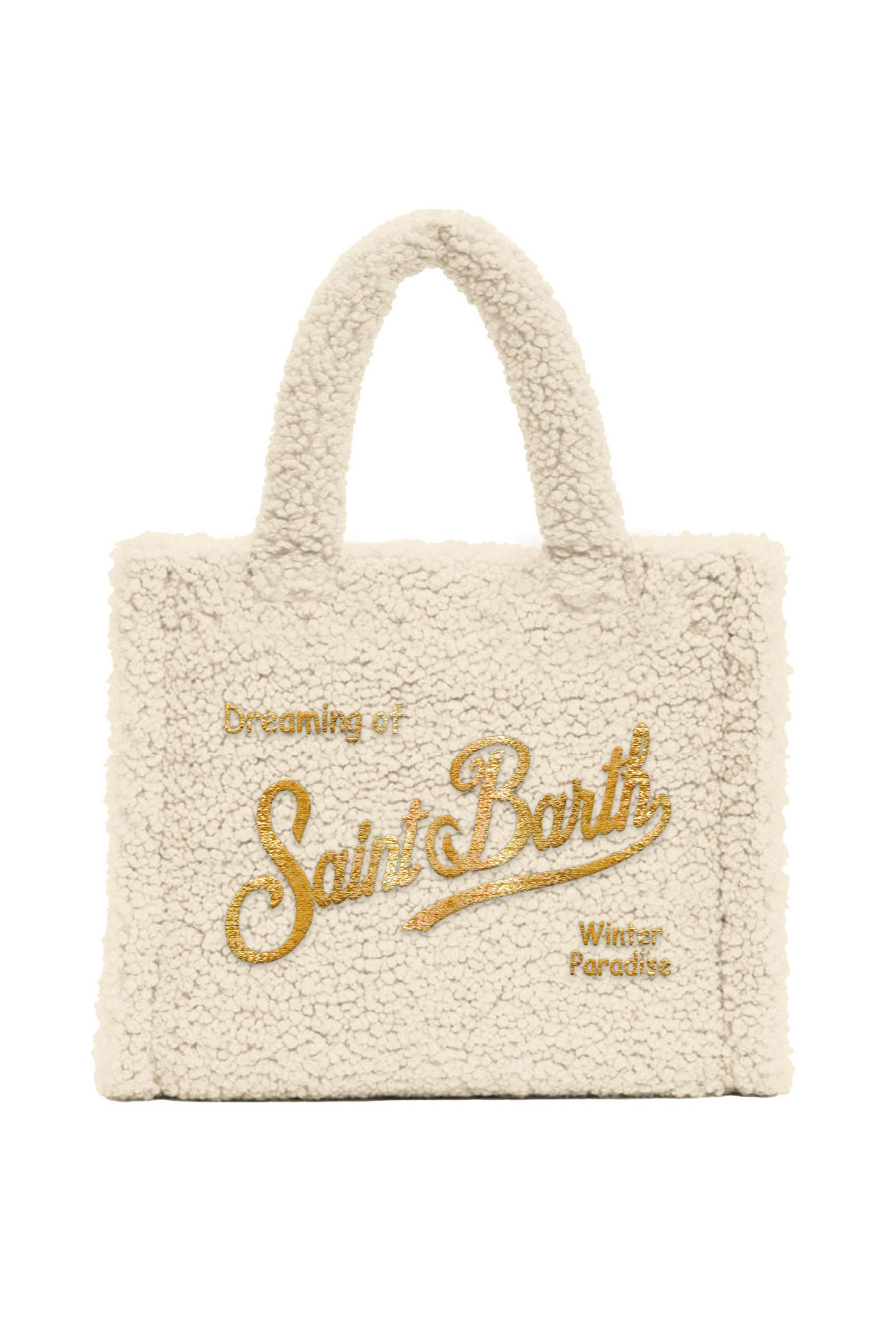 MINI BORSA PANNA IN TESSUTO TEDDY CON LOGO ORO.