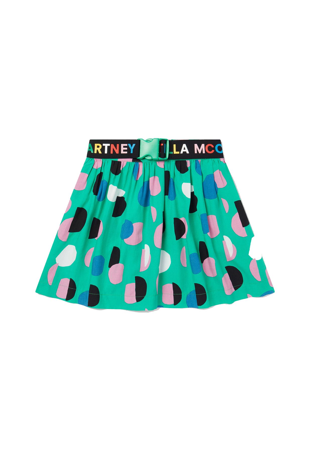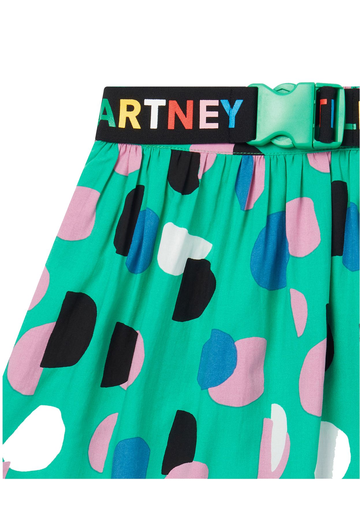 GONNA VERDE IN VISCOSA CON CINTURA E POIS MULTICOLOR.
