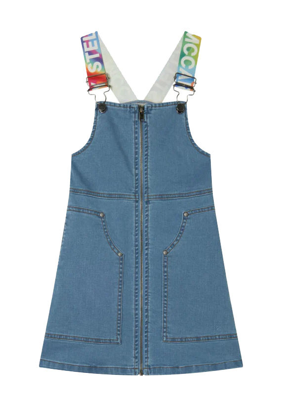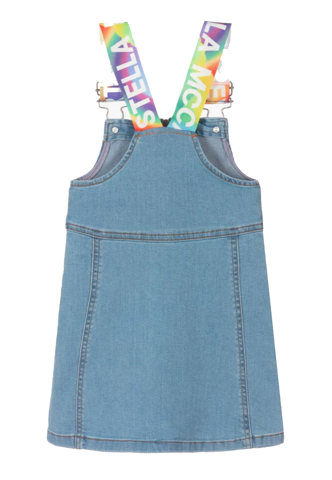 SALOPETTE IN JEANS CON CERNIERA E BRETELLE LOGATE MULTICOLOR.